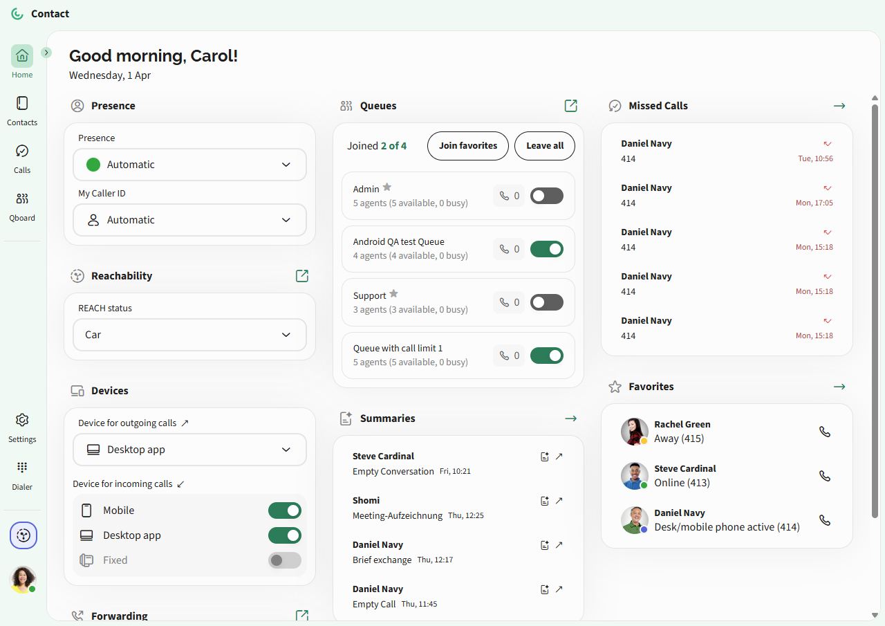 Home screen. Here you can find all information, such as presence, call forwarding, missed calls, active call queues, REACH status, favorites as well as summaries generated by