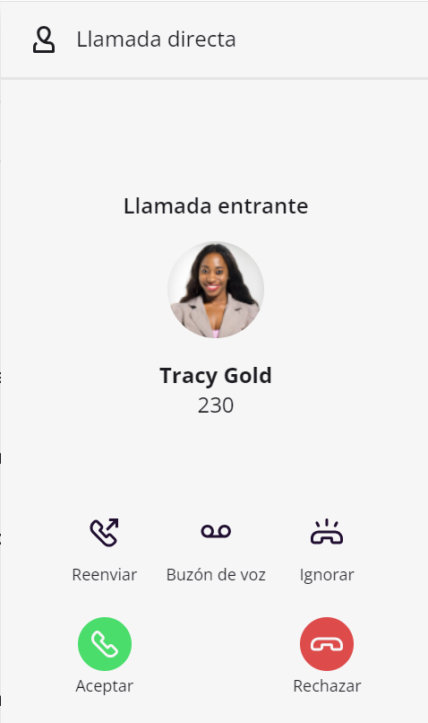 Cuando recibes una llamada, tienes varias opciones. Puedes aceptar la llamada, desviarla a otro destino, como un compañero o tu buzón de voz, o rechazarla.