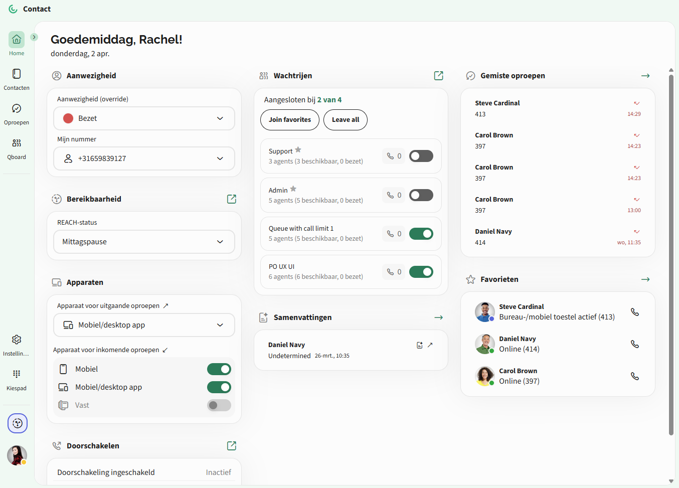 startscherm. Hier vind je alle informatie, zoals aanwezigheid, doorschakelen, gemiste oproepen, actieve wachtrijen, REACH-status, favorieten en samenvattingen gegenereerd door
