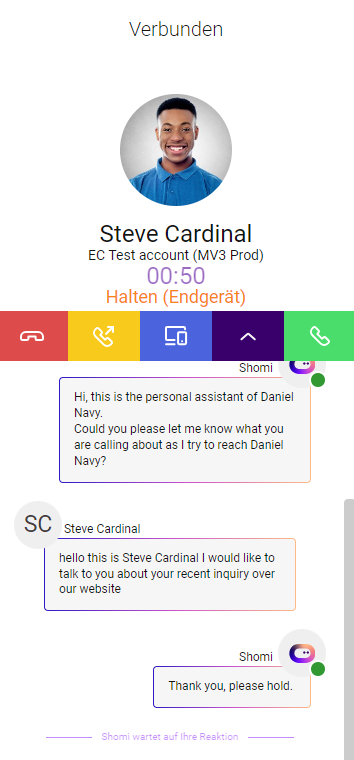 Sie erhalten einen eingehenden Anruf, während Sie beschäftigt sind. Sie können Shomi den Anruf entgegennehmen lassen und nach dem Grund des Anrufs fragen lassen, um zu entscheiden, ob Sie den Anruf annehmen oder weiterleiten möchten, z.B. an einen Kollegen oder an Ihre Voicemail.