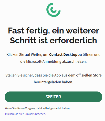 | Wenn die Meldung Ihre Authentifizierung ist abgelaufen erscheint, müssen Sie sich erneut mit Ihrem Microsoft-Konto authentifizieren. Microsoft kann Sie auffordern, sich häufiger anzumelden, bis Contact Desktop als vertrauenswürdige Anwendung erkannt wird. |