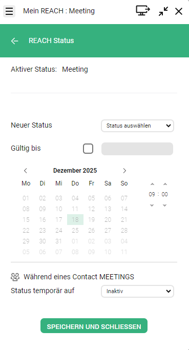 | Wenn ein manueller REACH Status eingestellt ist, bleibt dieser auch aktiv während Sie sich in einer Meeting Room-Sitzung oder einem MS Teams Anruf befinden. Um Ihre Erreichbarkeit und den entsprechenden REACH Status Während Meeting Room oder MS Teams Anruf zu aktivieren, müssen Sie die manuelle Statusüberschreibung deaktivieren, siehe So deaktivieren Sie die manuelle Statusüberschreibung. |