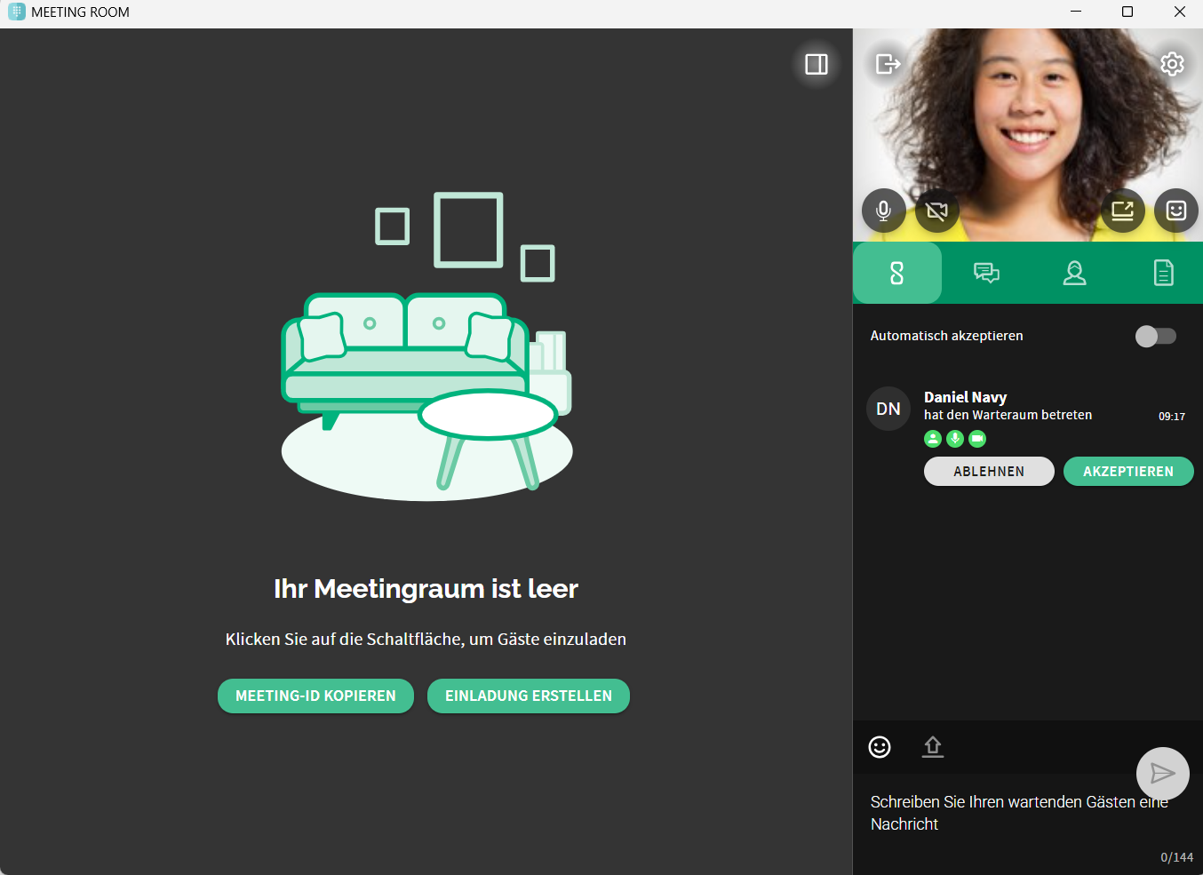 4 Wenn einer der eingeladenen Gäste die Meeting Room-Einladung angenommen hat, erhalten Sie eine Benachrichtigung.