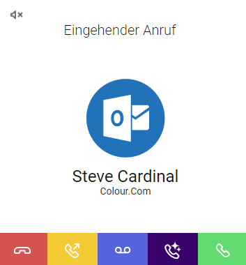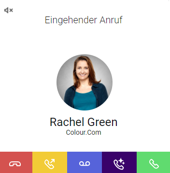 Geht für Sie ein Anruf ein, wird ein Anruf an Sie weitergeleitet oder geht ein Anruf ein an eine Gruppe, deren Mitglied Sie sind, erscheint ein Popup-Fenster Eingehender Anruf, welches die Kontaktinformationen des Anrufers enthält.