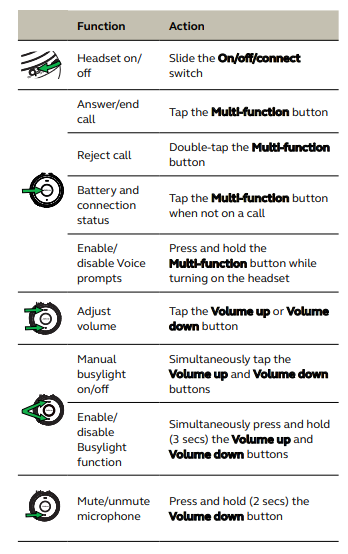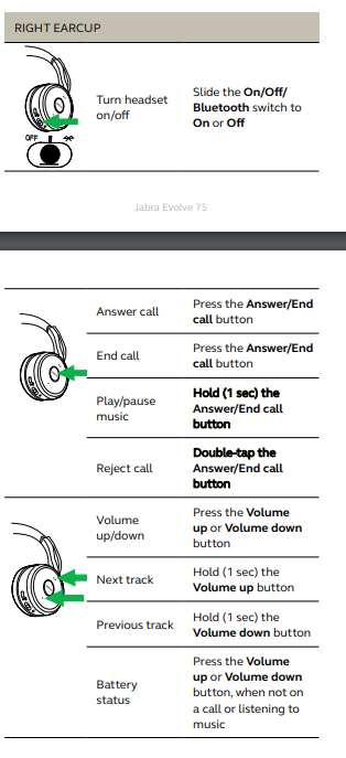 Sie können Funktionen von Headsets in Contact Desktop nutzen. Wenn Sie beispielsweise einen Anruf annehmen möchten, können Sie dies direkt von Ihrem Headset aus tun. Nachstehend finden Sie ein Beispiel dafür, was mit dem Jabra Evolve 65 und 75 möglich ist.