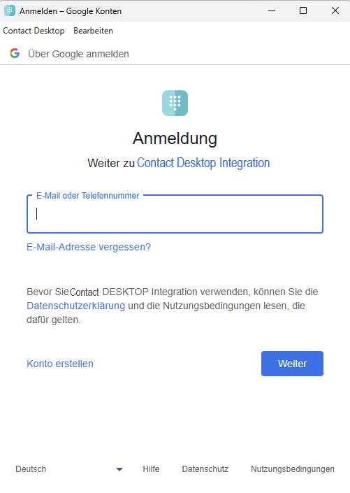Google Integration ermöglicht die Integration Ihrer Google-Kontakte in Contact Desktop. Ein eingehender Anruf von einem Ihrer Google-Kontakte wird mit der Google-Integration mit dem Namen Ihres Kontakts in Contact Desktop angezeigt. Alle Ihre Google-Kontakte finden Sie in Contact Desktop auch unter Telefonbuch.