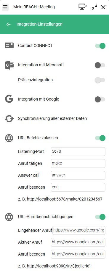 Anruf tätigen | Dieses Feld definiert das Befehlssegment, das verwendet wird, um einen ausgehenden Anruf über eine URL-Anfrage auszulösen. Um eine Nummer zu wählen, sendet der Drittanbieter eine HTTP-Anfrage an den Listening-Port, die sowohl das Befehlskennwort als auch die Zielrufnummer enthält. Beispiel: http://localhost:5678/make/020123456 Wenn diese URL aufgerufen wird, beginnt die Anwendung sofort mit dem Wählen von 020123456. |