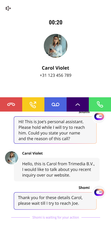 You receive an incoming call while busy. You can let Shomi answer the call and ask what the calling reason is to decide whether you want to take it or forward it, e.g. to a colleague or to your voicemail.