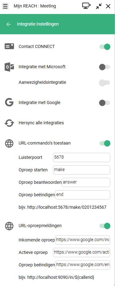 Oproep starten | Dit veld definieert het commandosegment dat wordt gebruikt om via een URL-request een uitgaand gesprek te starten. Om een nummer te bellen, stuurt de externe applicatie een HTTP-request naar de listenerpoort, inclusief zowel het commandowoord als het bestemmingsnummer. Voorbeeld: http://localhost:5678/make/020123456 Wanneer deze URL wordt aangeroepen, start de applicatie onmiddellijk met het bellen van 020123456. |