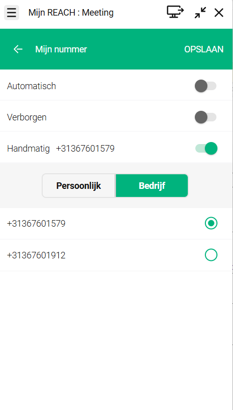 Handmatig: een zelfgekozen nummer, je persoonlijke of bedrijfsnummer, wordt gebruikt als nummerweergave voor alle uitgaande gesprekken