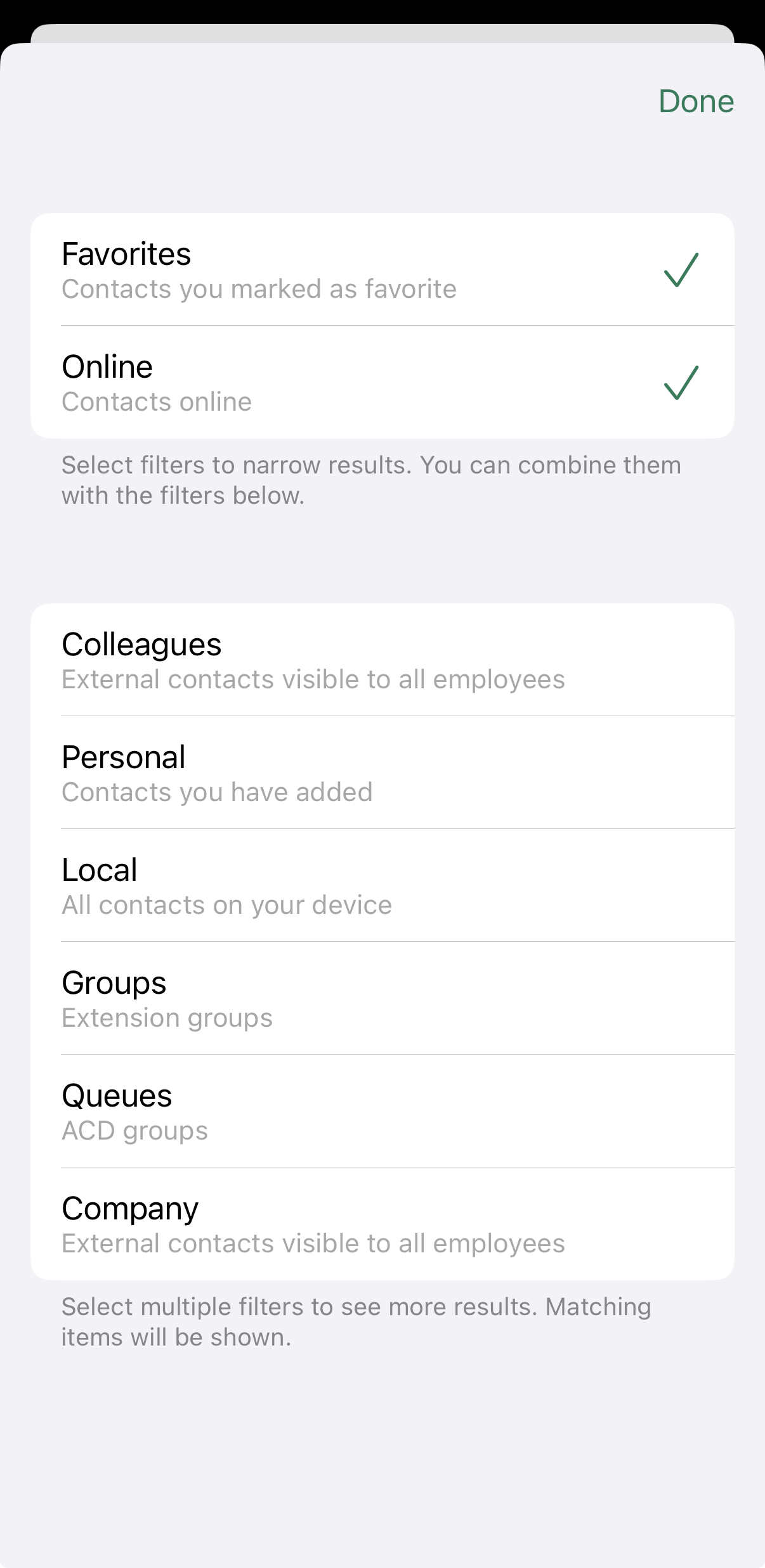 You can individually select which contact sources should be displayed in your contact list. Additionally, the displayed contacts can be filtered by favorites and/or availability. For example, if you have selected the contact source Colleagues and the filter Online you can quickly see who of your colleagues is available.