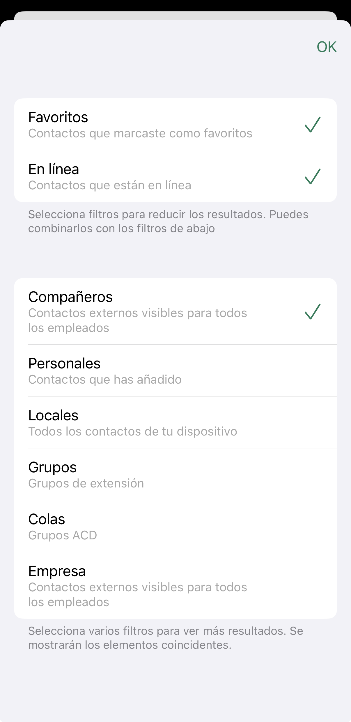 Puedes seleccionar individualmente qué fuentes de contacto deben aparecer en tu lista de contactos. Además, los contactos mostrados se pueden filtrar por favoritos y/o disponibilidad. Por ejemplo, si has seleccionado la fuente de contacto Compañeros y el filtro En línea, puedes ver rápidamente quiénes de tus Compañeros están disponibles.