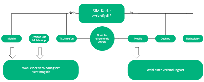 Anrufe werden sowohl über das mobile Netz als auch über die Contact Mobile Mobile und Desktop Apps und auf dem Tischtelefon signalisiert. Dies kann zu unvorhergesehenem Verhalten führen und wird deshalb nicht empfohlen.