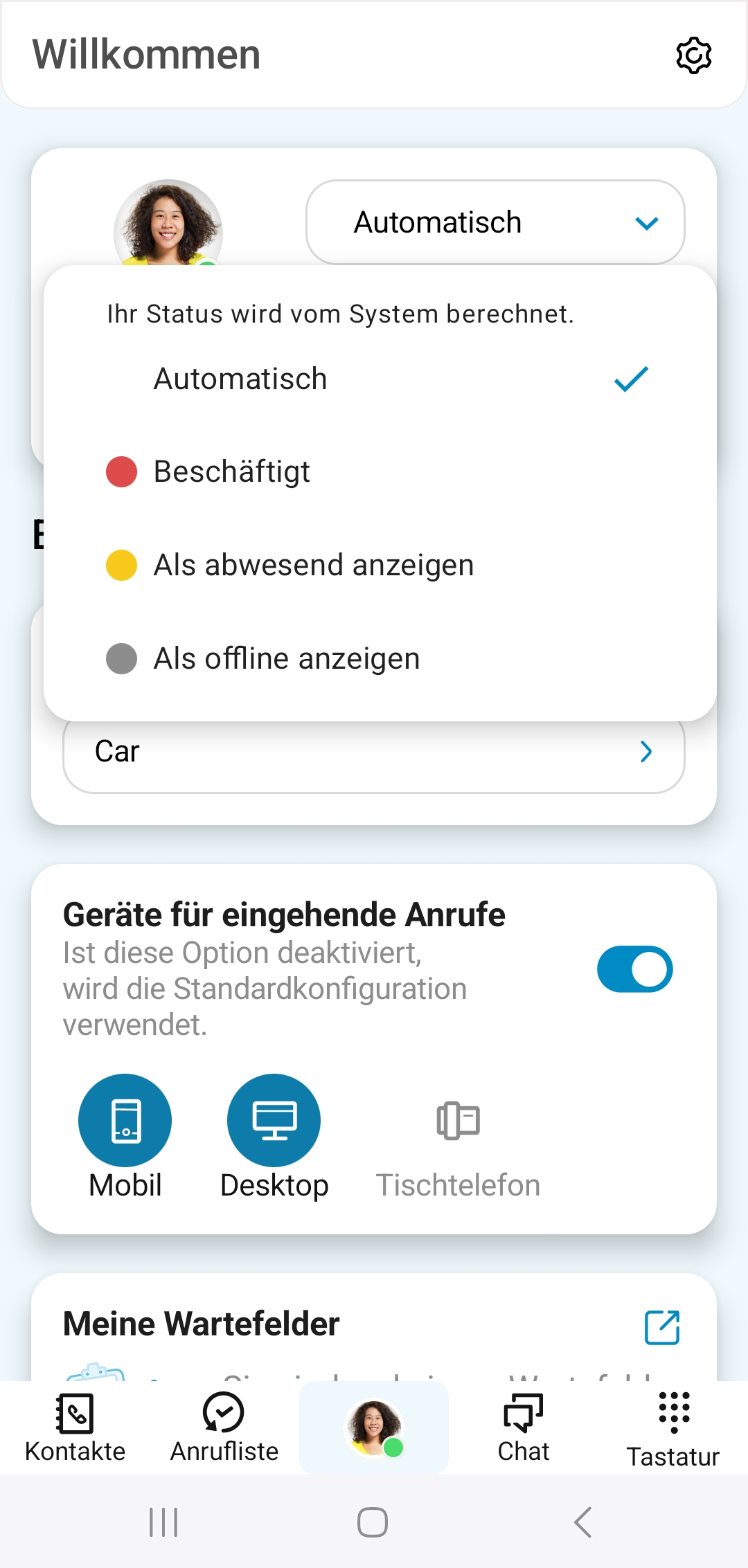 Sie können Ihren eigenen Status auswählen. Zur Verfügung stehen Automatisch, Beschäftigt, Als abwesend anzeigen und Als offline anzeigen.