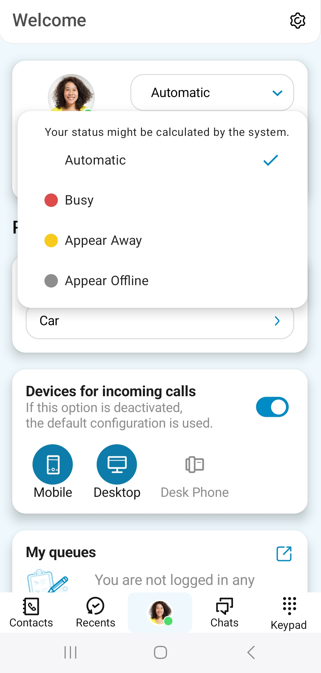 You can select your own status. The available options are Automatic, Appear Away, Busy and Appear Offline.