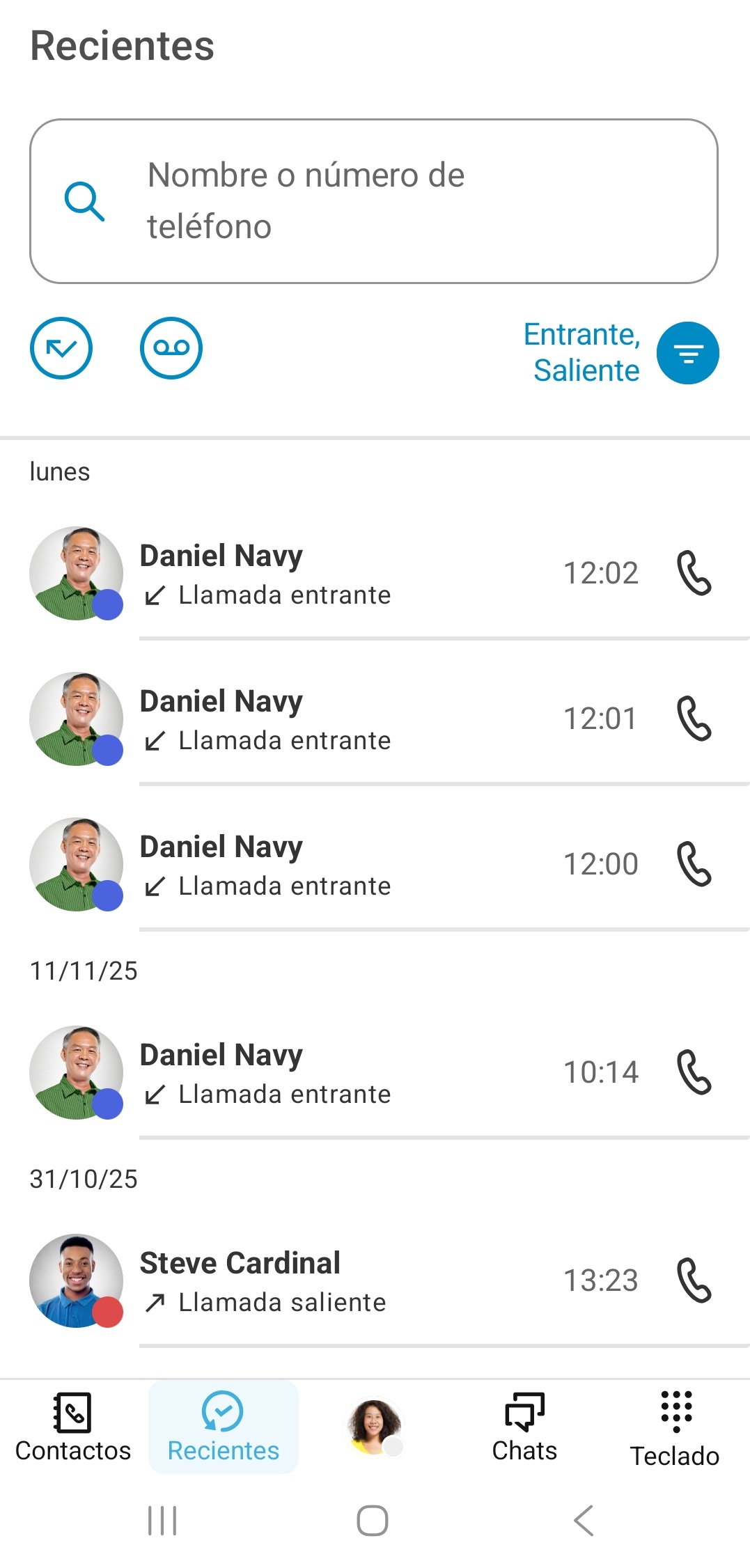 En la sección Recientes, todas las llamadas recibidas y realizadas se enumeran cronológicamente.