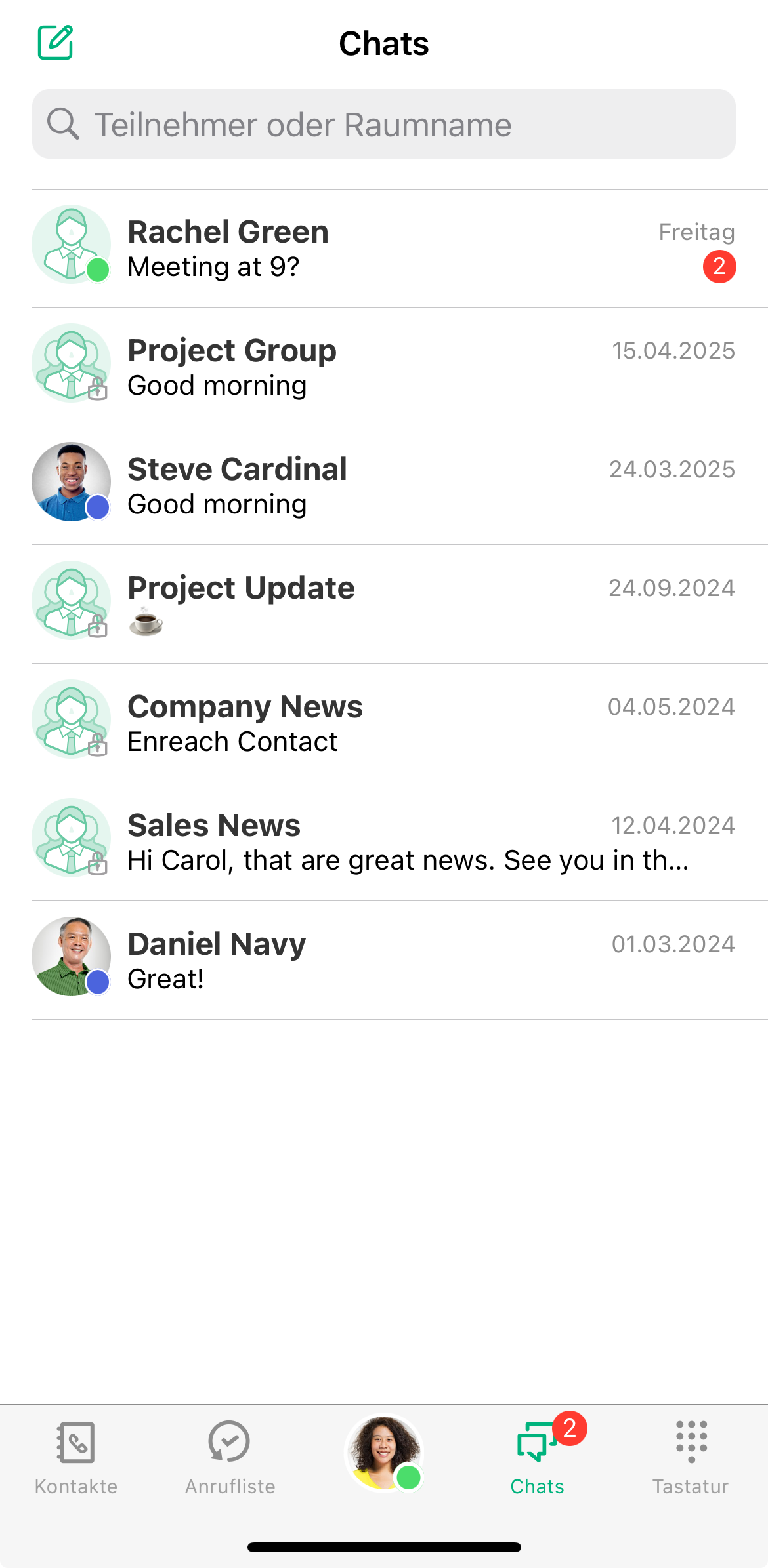 Über das Suchfeld können Sie innerhalb der Chats gezielt nach Teilnehmern oder Raumnamen suchen.