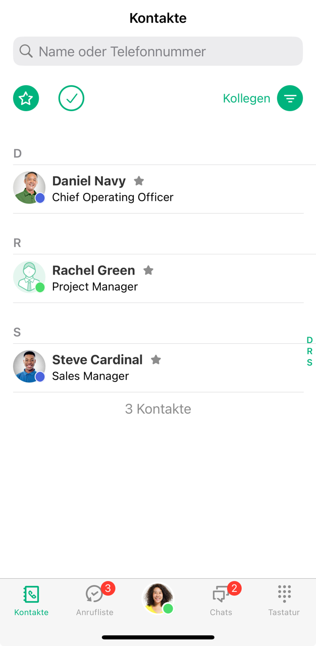 2 Um die Kontaktquelle zu ändern, tippen Sie auf den aktiven Filter Kollegen,Dienste, Persönliche, Lokale, Gruppen, Wartefelder oder Unternehmen.