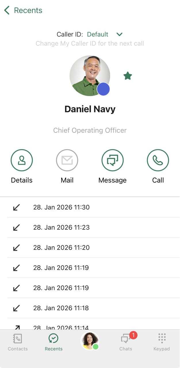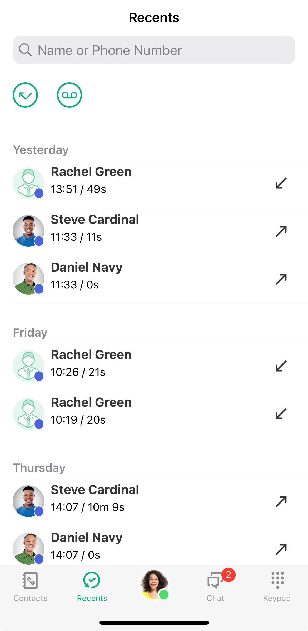 If you have missed or declined calls, the number of missed calls is displayed in the bar next to Recents if the area is not in focus.