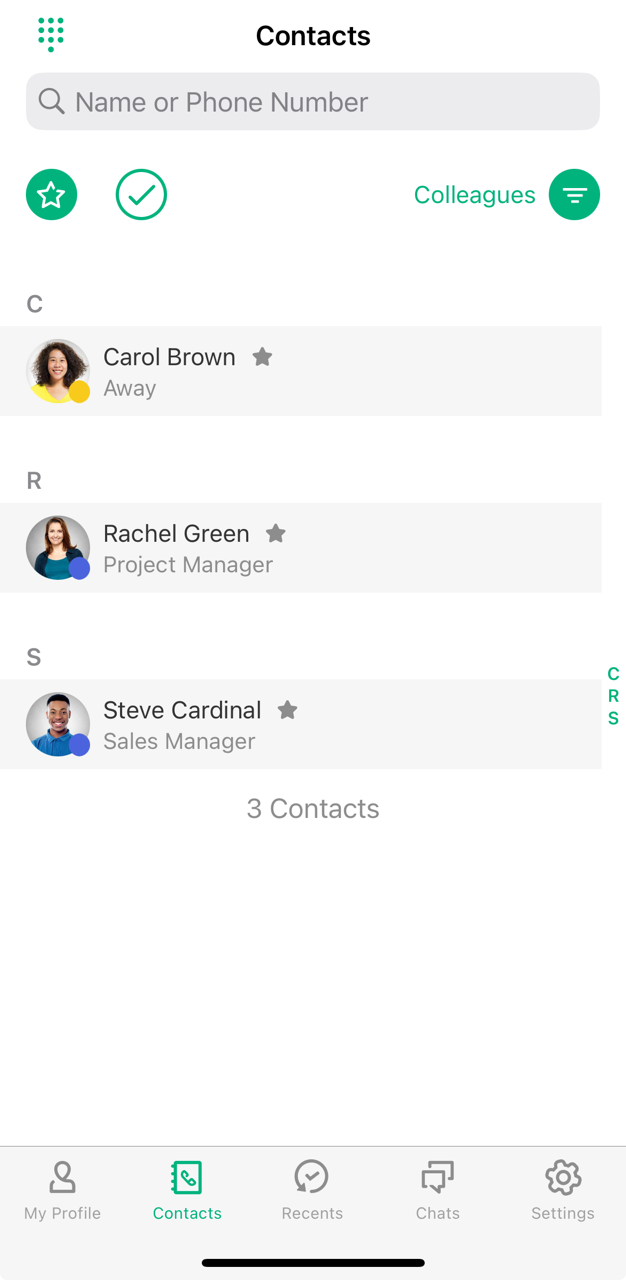 2 To change the contact source, tap on the active filter Colleagues,Services, Personal, Local, Groups, Queues or Company.