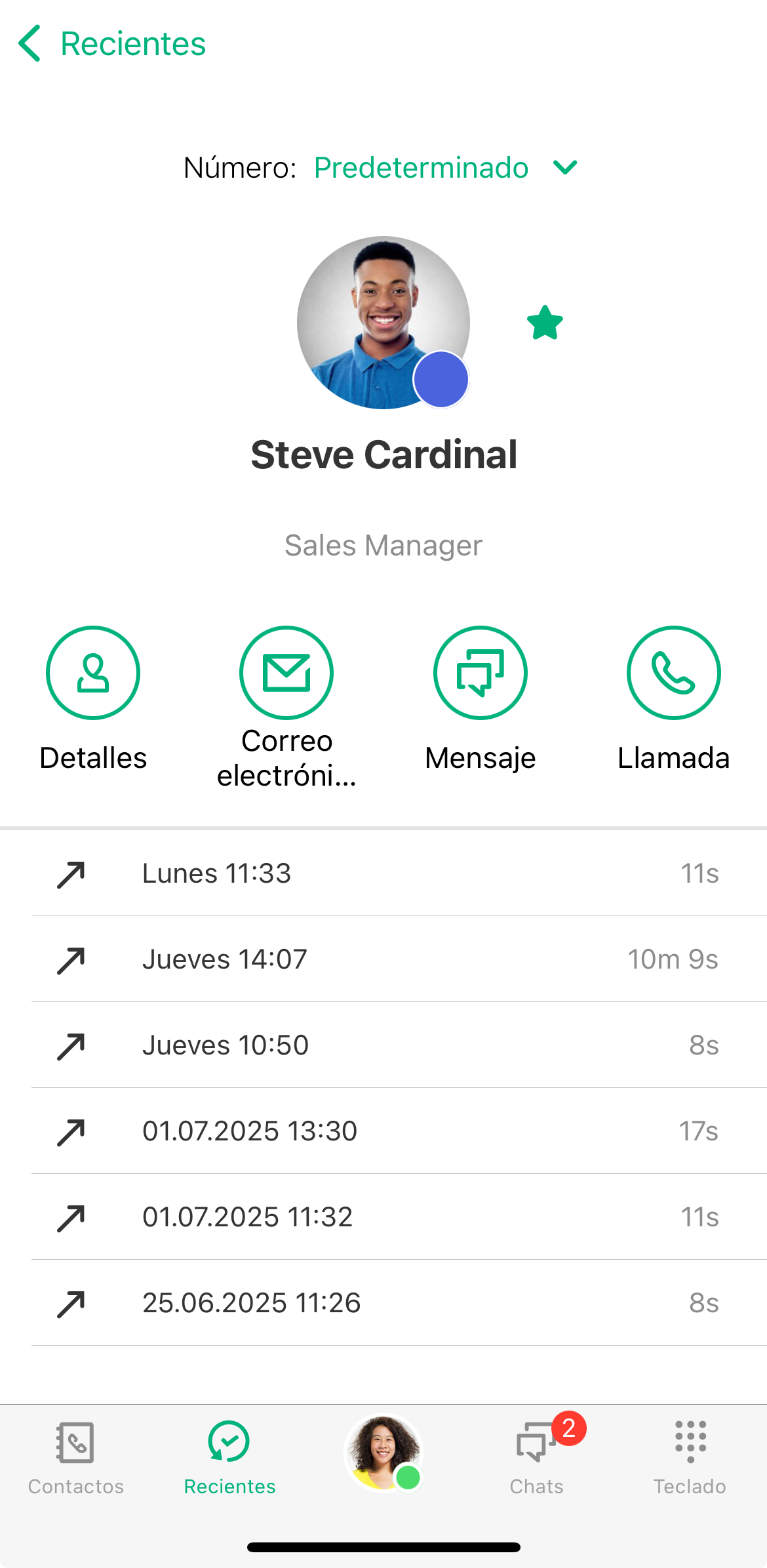 En la sección Recientes, todas las llamadas recibidas y realizadas se enumeran cronológicamente.