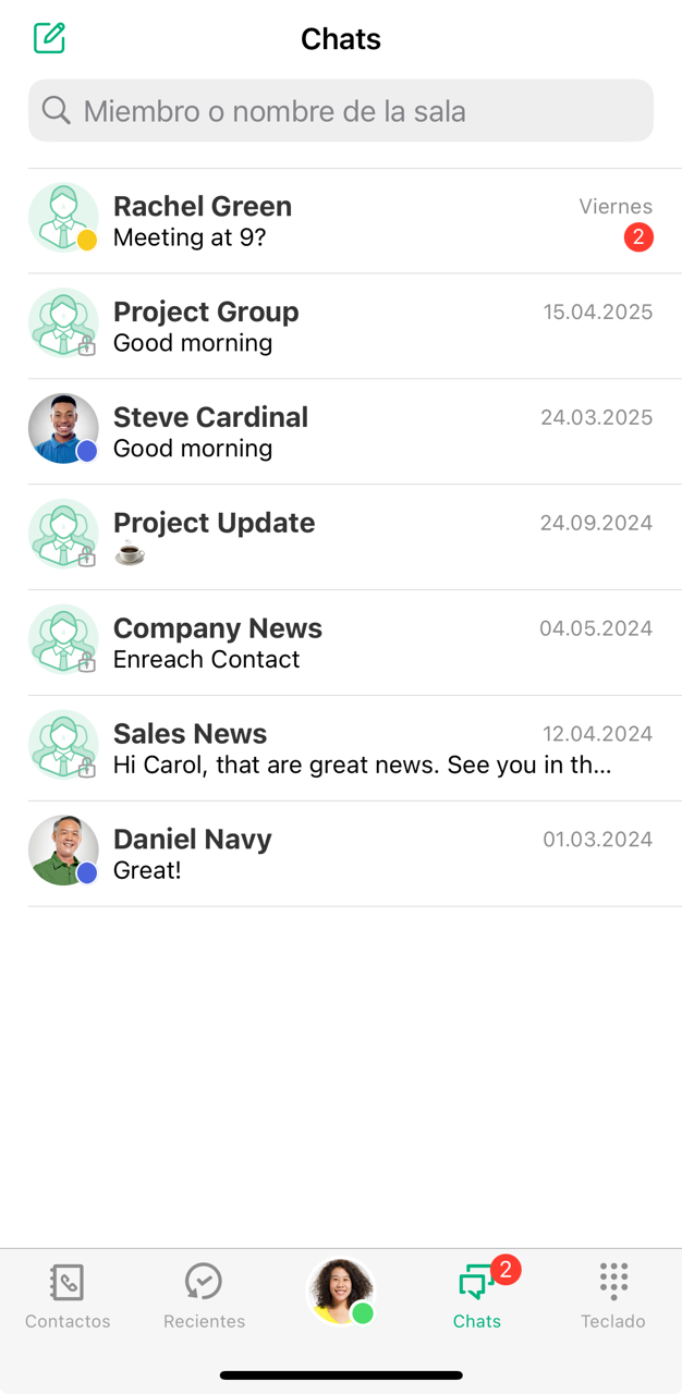 Puedes utilizar el campo de búsqueda para buscar específicamente miembros o nombres de salas dentro de los chats.