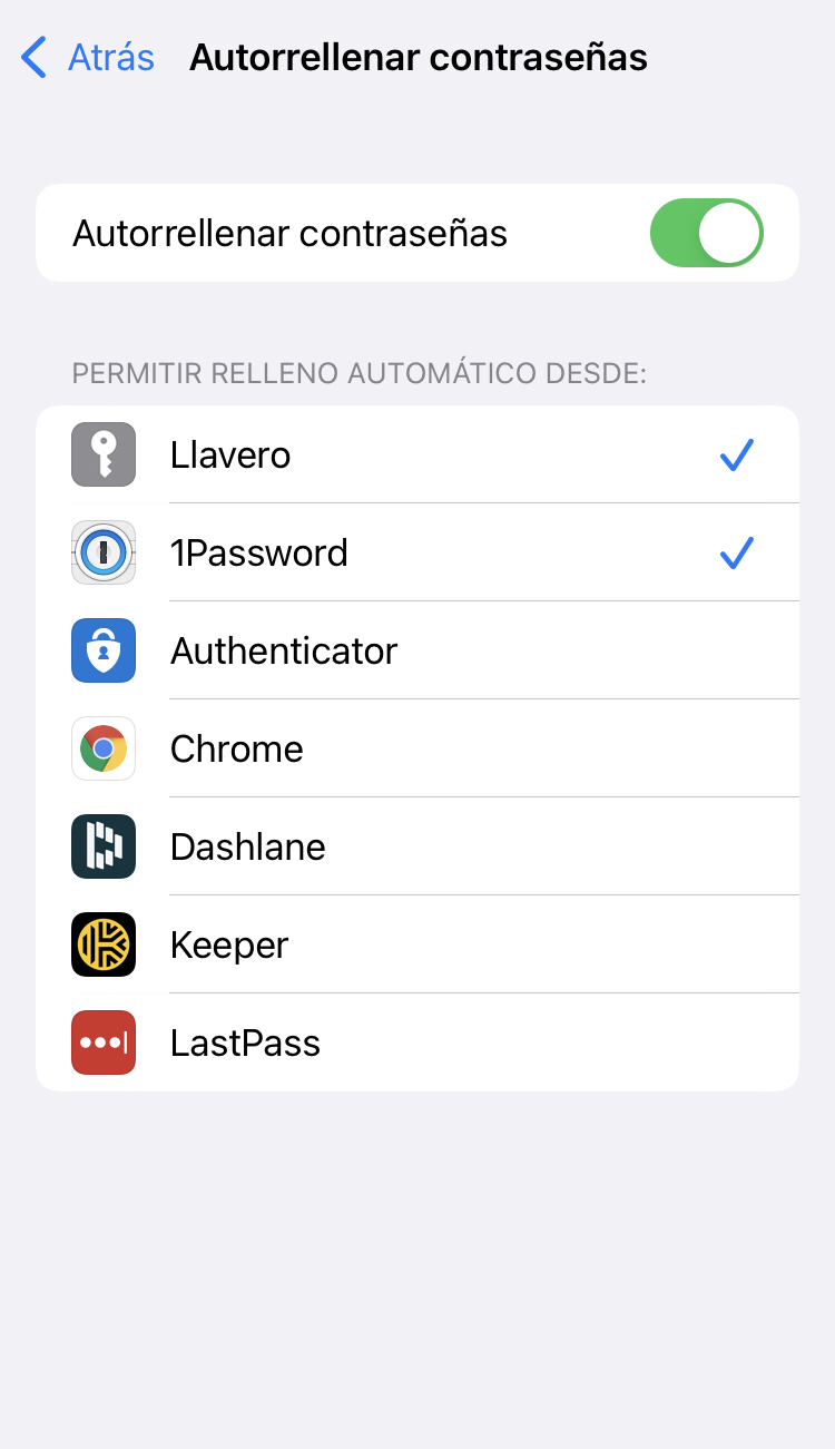 | Sólo puedes utilizar Autocompletar contraseñas si ha almacenado credenciales en un gestor de contraseñas. También puedes seleccionar sólo dos gestores de contraseñas de la lista: el Llavero (de iCloud) y/o un gestor de contraseñas de terceros. |