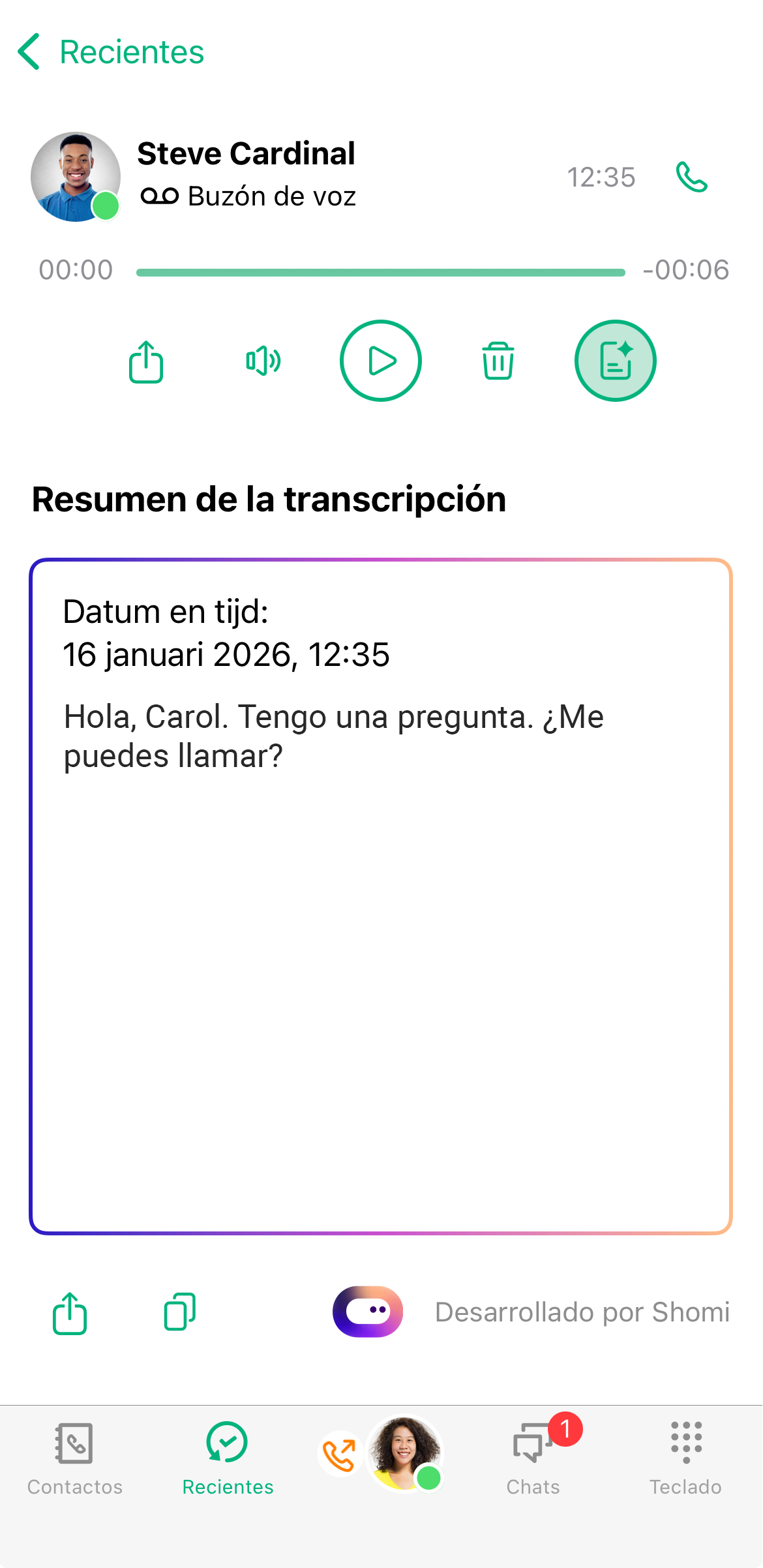 El mensaje de voz se convierte en texto y se muestra.