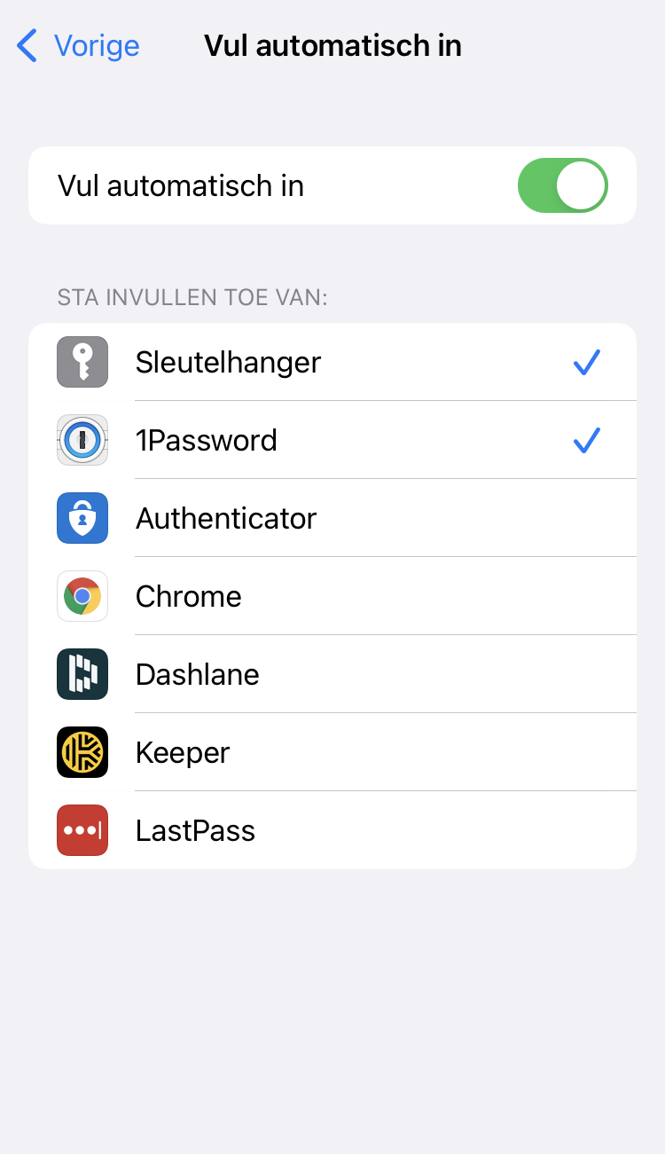 | Je kunt Vul automatisch in alleen gebruiken wanneer je de inloggegevens in een wachtwoordbeheerder hebt opgeslagen. Je kunt ook maar twee wachtwoordbeheerders uit jouw lijst kiezen: de (iCloud) Sleutelhanger en/of een wachtwoordbeheerder van een derde partij. |
