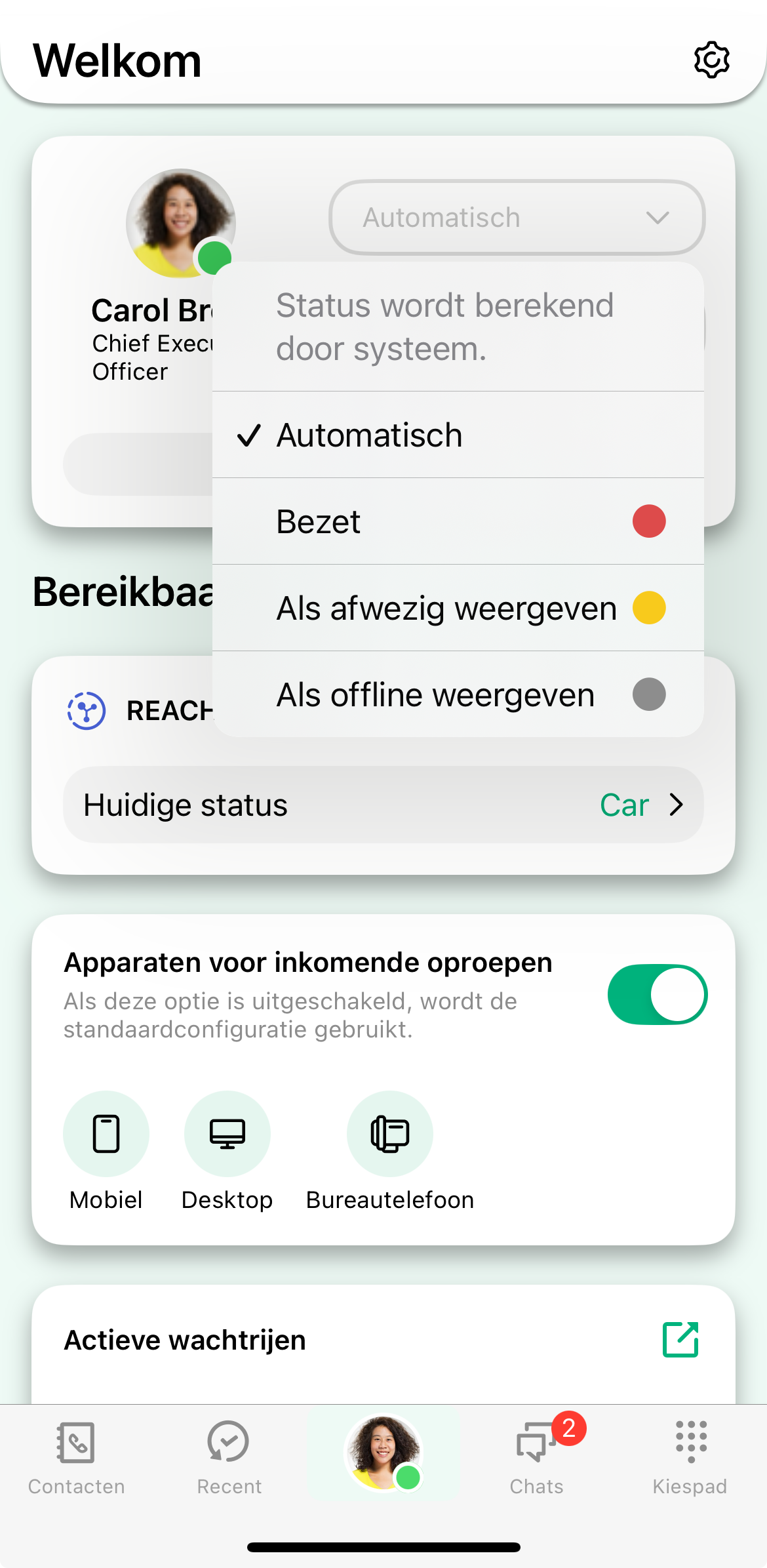 Je kunt jouw eigen aanwezigheidsstatus individueel instellen. De beschikbare opties zijn